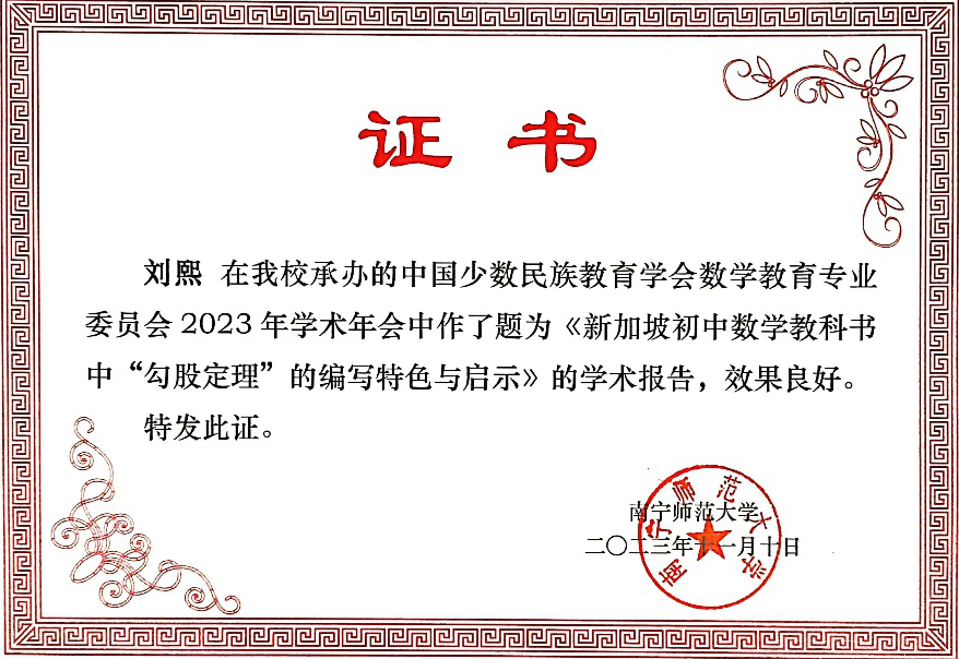 11月9日下午,数学与信息技术学院2023年新进教师刘熙在年会中作了题为《新加坡初中数学教科书中“勾股定理”的编写特色与启示》的报告。报告中,刘熙介绍了新加坡DM版教科书中勾股定理内容的编排方式和习题的设置情况,明晰了其编写特色,并在新一轮义务教育初中数学教科书修订的背景下,提出我国教科书中勾股定理内容的编写建议。