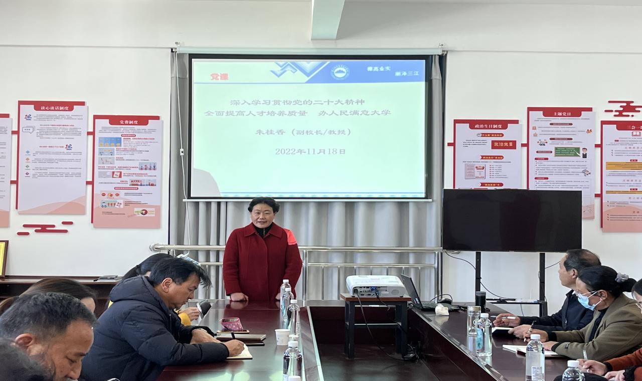 为深入学习贯彻党的二十大精神,将习近平总书记对教育的重要论述落实到学校的发展建设和人才培养工作中,2022年11月18日,朱桂香副校长在实训楼615为旅游与经济管理学院和数学与信息技术学院的40余名党员讲授了一堂学习和贯彻党的二十大精神的生动思政课。