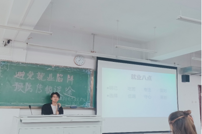 讲座中廖辰宏结合自己的实习终于到的亲身经历,给同学们讲述了就业八个要点:明己、吃苦、专注、面对、选择、低调、守心、果断。为同学们介绍就业陷阱:主要分为虚假广告陷阱、色情陷阱、协议陷阱、试用期陷阱、收费陷阱、薪酬陷阱、智力陷阱、传销陷阱。传销的行为方式:有定制目标、巧设骗局、魔鬼词典、摊牌翻脸、跟进骗局。传销的特征:有对照识别、特征识别、惯用名词、常用说辞。