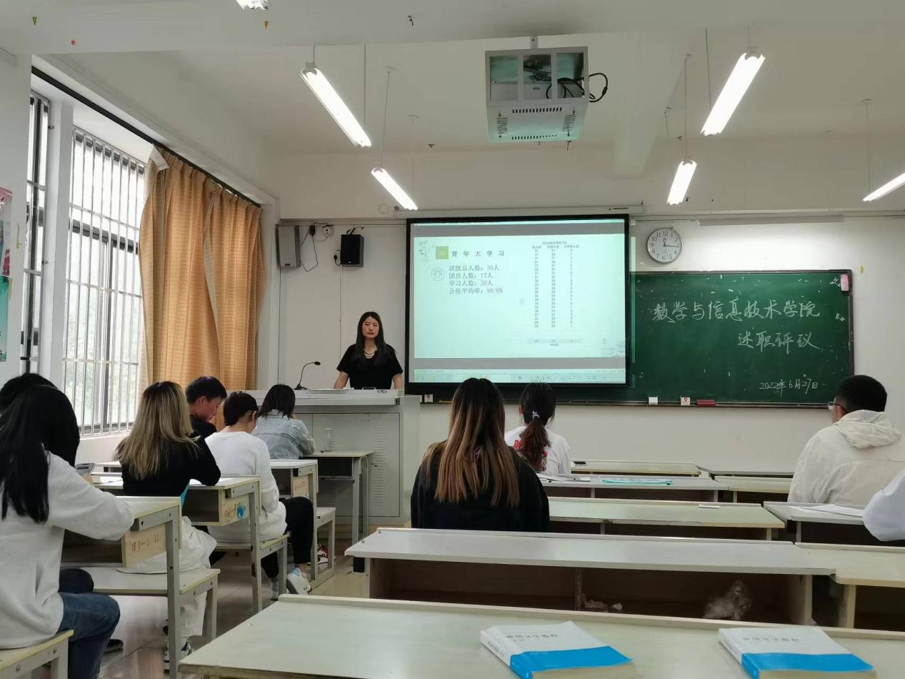 为了加强团学组织建设,提升组织规范化建设水平,总结以往的工作经验,并对未来工作做出改进和规划部署。2022年6月27日上午12时,数学与信息技术学院在教学楼217教室顺利召开团支部书记述职评议大会,数学与信息技术学院团总支干部与各班团支部书记参与此次会议。